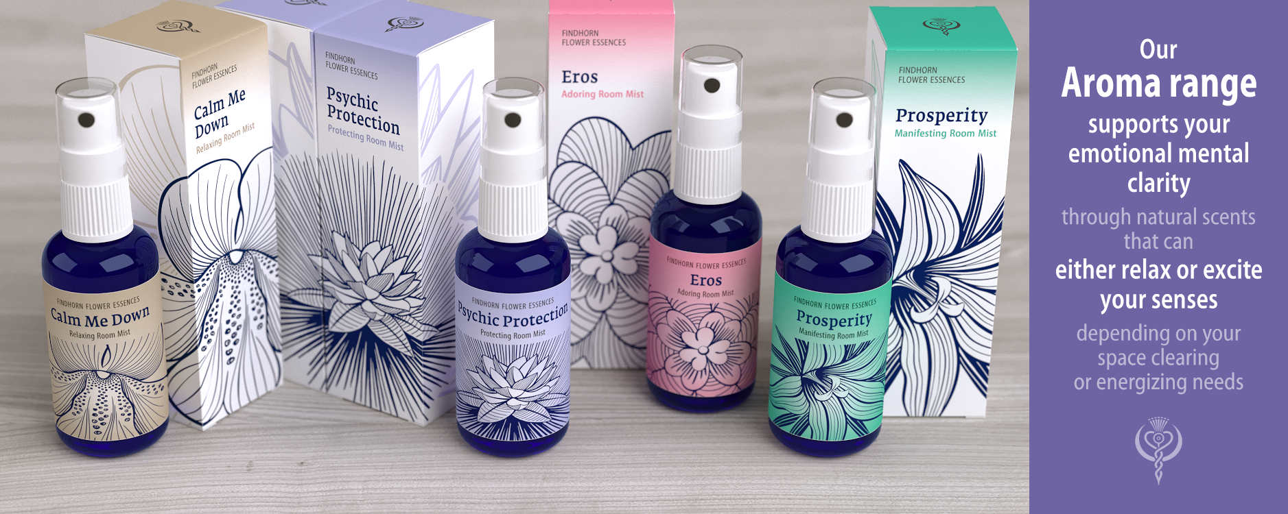 The Findhorn Room Mist Kit contains 4 x 50ml Findhorn Room Mists including the CALM Calming, PSYCHIC Protecting, EROS Adoring and PROSPERITY Manifesting.