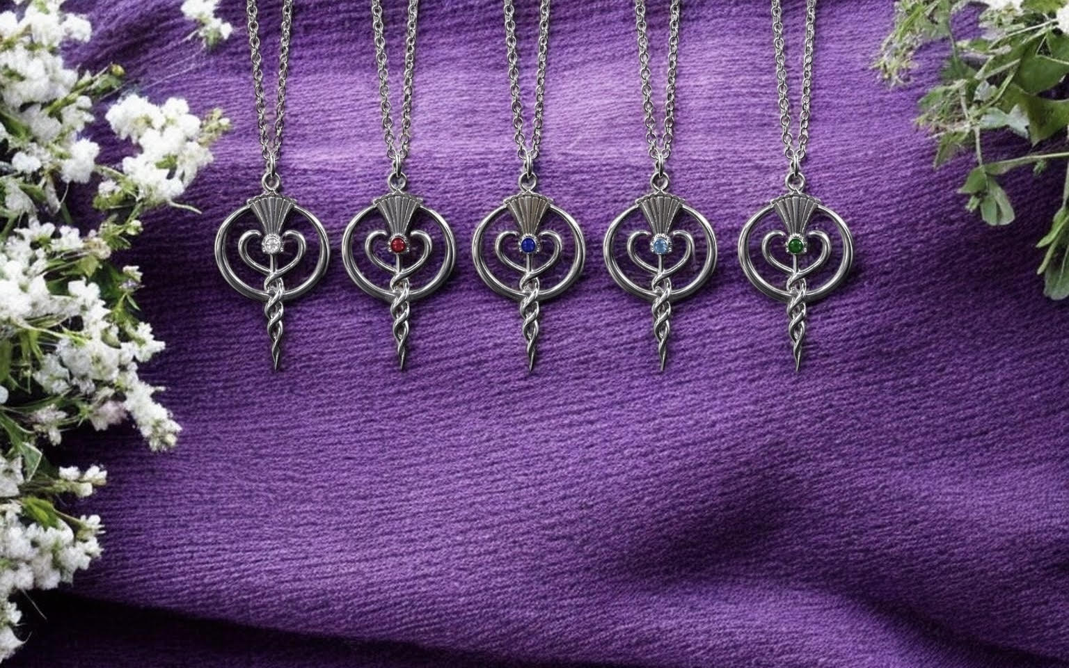 Small Silver Thistle Logo Necklace with your choice of coloured centred gemstone.